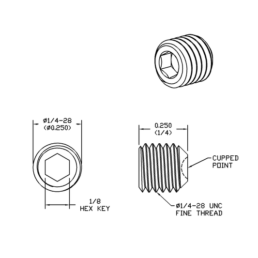 1/4-28 x 1/4 Lg, Fine Thread, Socket Set Screw, Cupped Point, Black Oxide Finish