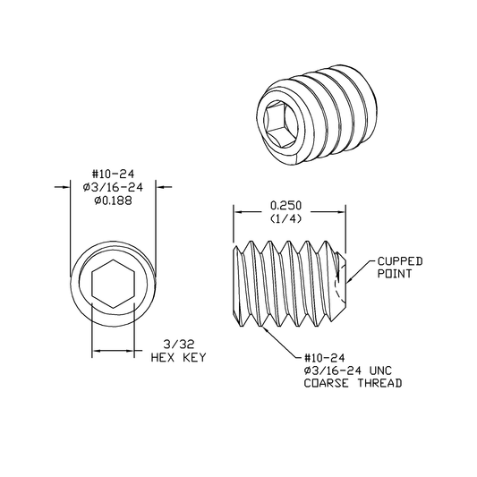 3/16-24 x 1/4 Lg, Standard Thread, Socket Set Screw, Cupped Point, Black Oxide Finish