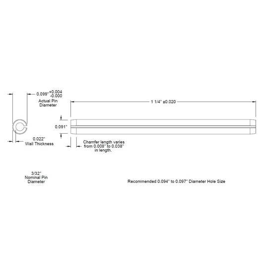 3/32 Dia. (.093), SAE Roll Pin x 1 1/4 (1.250) lg., long, Slotted Spring Pin