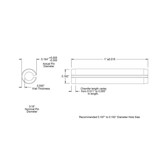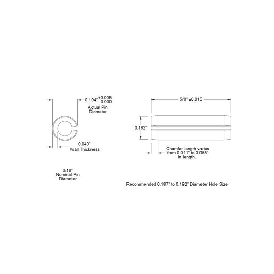 3/16 Dia. (0.188), SAE Roll Pin x 5/8 (0.625) lg., long, Slotted Spring Pin